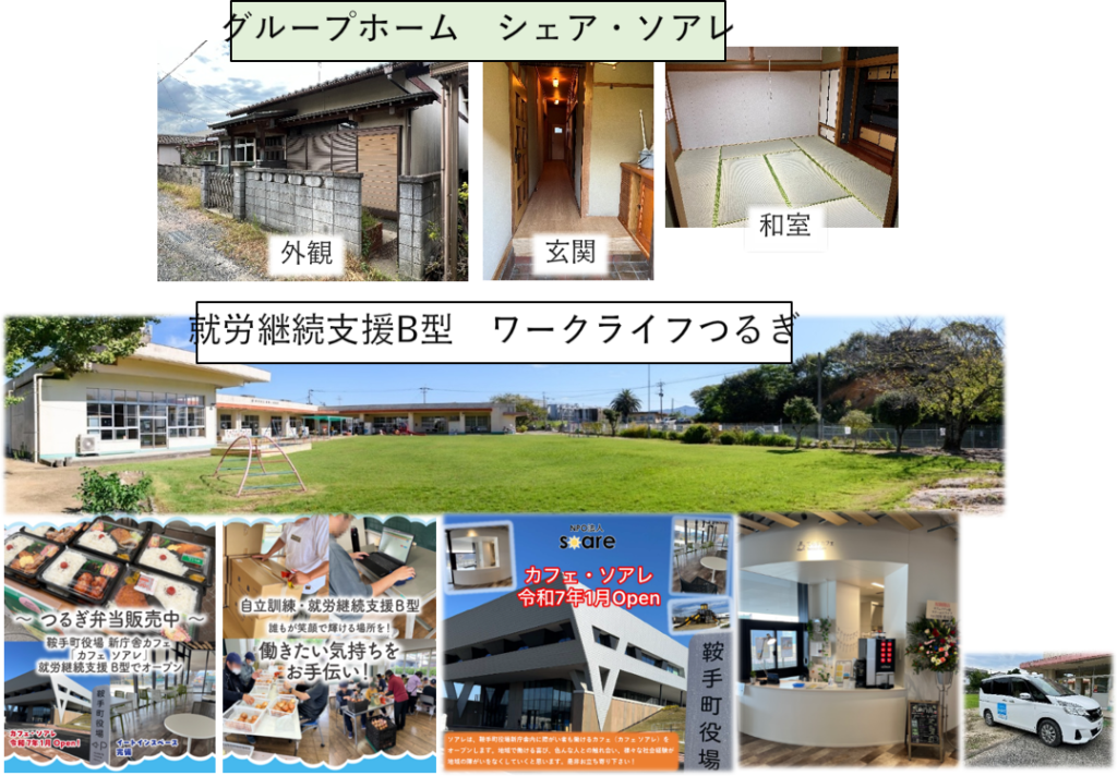 就労継続支援B型「ワークライフつるぎ」「カフェ・ソアレ」 【事業内容】・つるぎ弁当(就労継続支援B型) ・つるぎ食堂(こども食堂、地域食堂) ・ミニつるぎ食堂(フードパントリー) |
